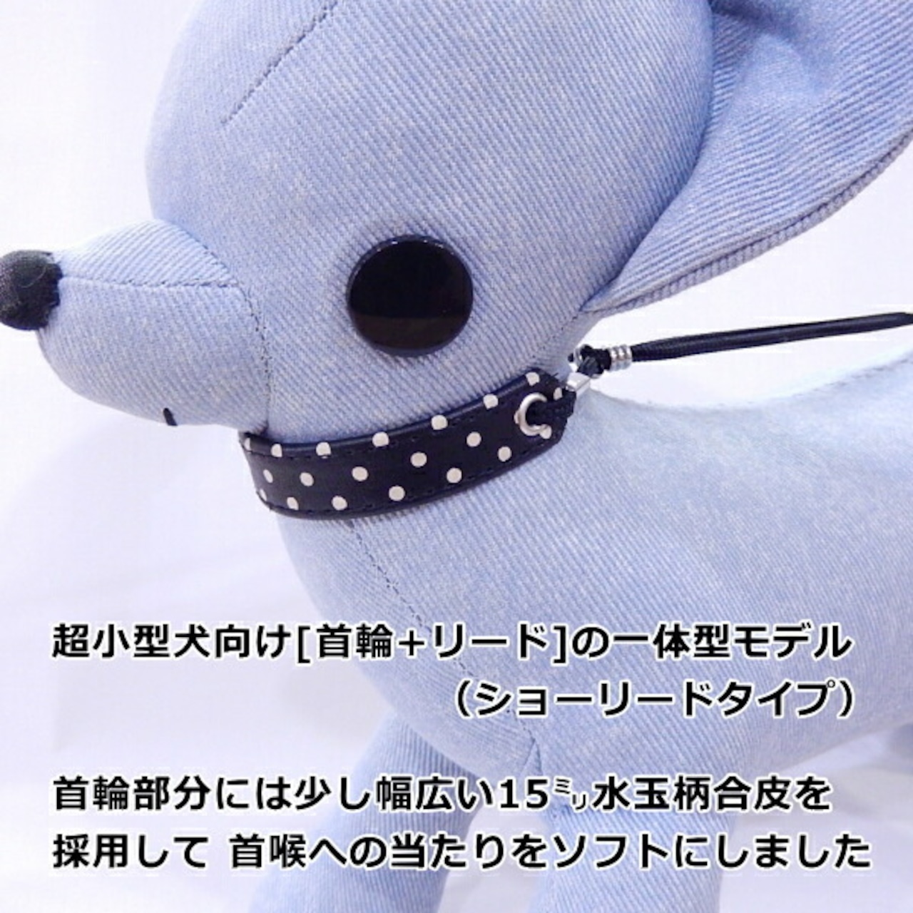 首輪リードの一体型モデル、少し幅広の水玉柄合皮で食い込み軽減です