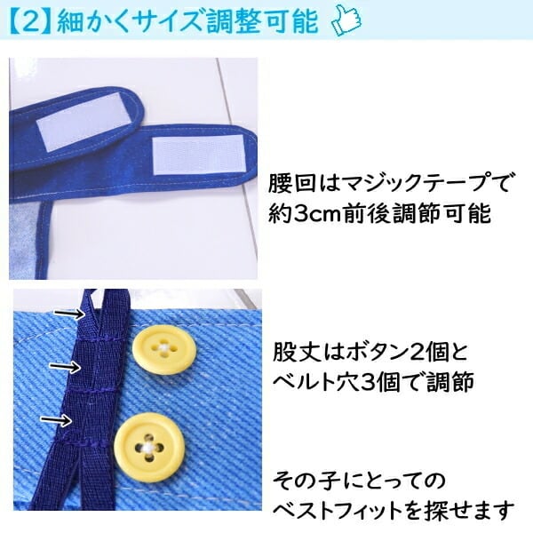 股丈はボタン2つとベルト穴3つで調節。ナプキンの厚みを加味してもその子にとってフィットする位置を合わせられます